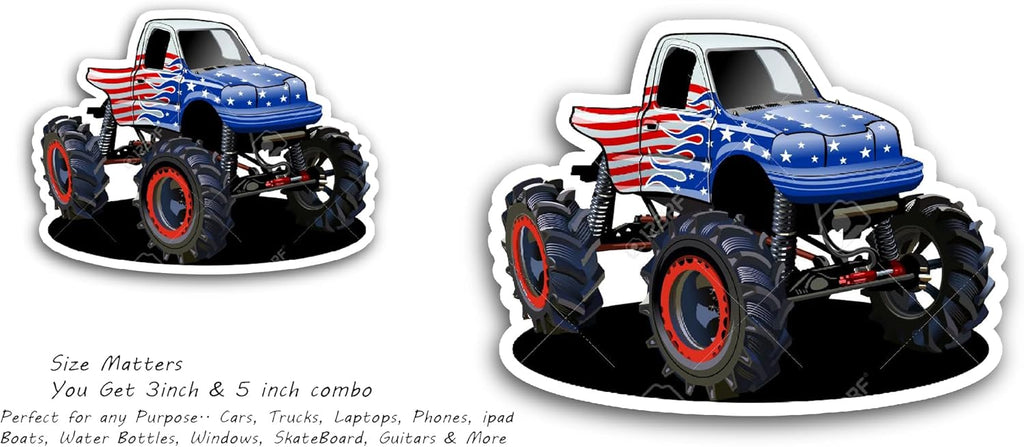2 (Pieces) 3" and 5" Monster Truck Painted with Flag Sticker, Waterproof Vinyl Decals for Many Purpose Like Cars, Trucks, Laptops, Phones, Windows and More