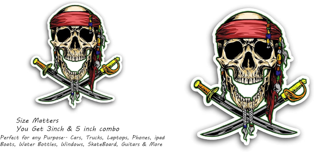 2 (Pieces) 3" and 5" Pirates Skull with Swords Sticker, Waterproof Vinyl Decals for Many Purpose Like Cars, Trucks, Laptops, Phones, Windows and More