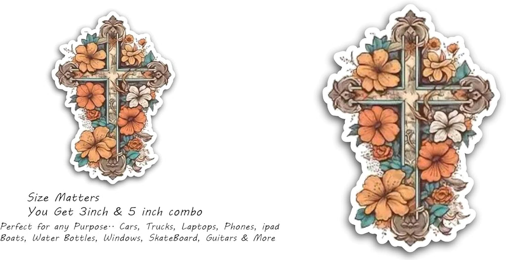 2 (Pieces) 3" and 5" Cross with Flowers at The Center Decal Sticker, Waterproof Vinyl Decals for Many Purpose Like Cars, Trucks, Laptops, Phones, Windows and More