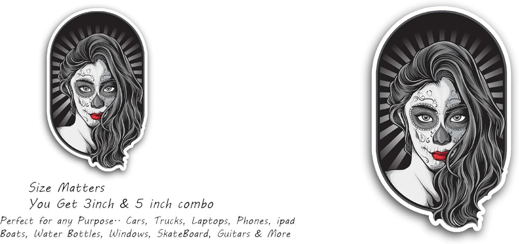 2 (Pieces) 3" and 5" Sugar Skull Lady Sticker, Waterproof Vinyl Decals for Many Purpose Like Cars, Trucks, Laptops, Phones, Windows and More