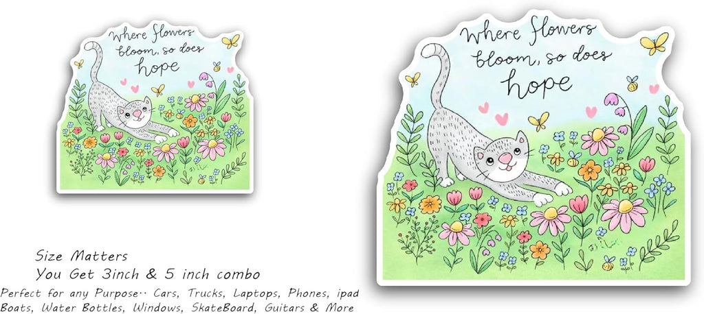 2 (Pieces) 3" and 5" Cat in Flower Garden Sticker, Waterproof Vinyl Decals for Many Purpose Like Cars, Trucks, Laptops, Phones, Windows and More