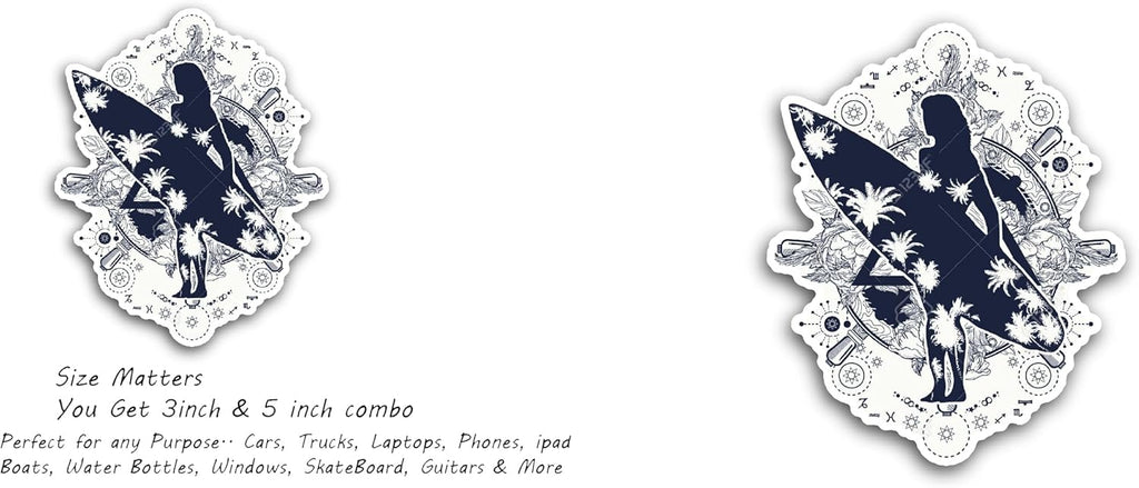 2 (Pieces) 3" and 5" Surfing Board with a Girl Sticker, Waterproof Vinyl Decals for Many Purpose Like Cars, Trucks, Laptops, Phones, Windows and More