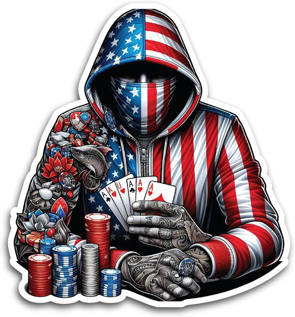 2 (Pieces) 3" and 5" Mask Man in Casino with Cards in American Flag Hoodie Decal Sticker, Waterproof Vinyl Decals for Many Purpose Like Cars, Trucks, Laptops, Phones, Windows and More