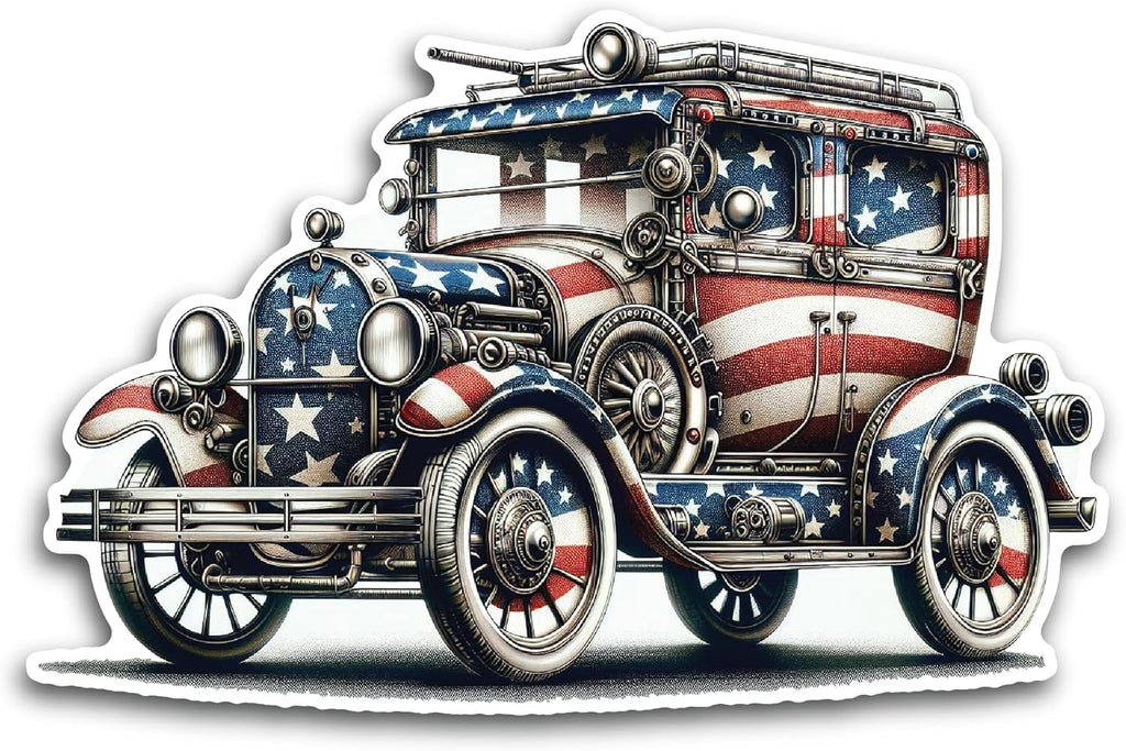 2 (Pieces) 3" and 5" Vintage Car with USA Flag Design Decal Sticker, Waterproof Vinyl Decals for Many Purpose Like Cars, Trucks, Laptops, Phones, Windows and More