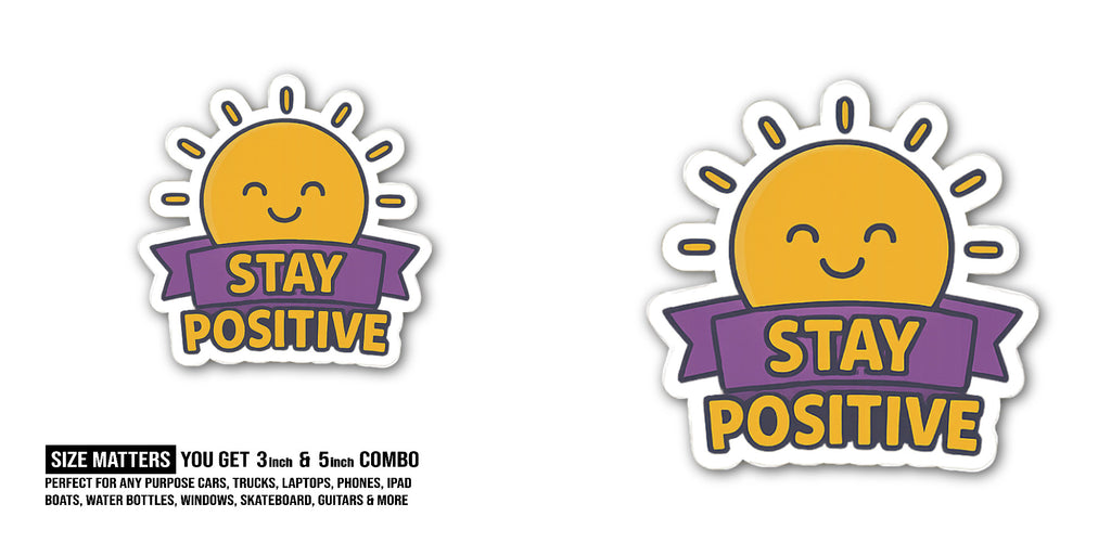 - SIZE MATTERS: Each decal measures approximately 5 inches and 3 inches (2) Pieces- 3 inches and 5 inches. Stay Positive Like Sun Sticker DESIGN: This vinyl decal features a design perfect for customizing vehicles, trucks, laptops, windows, computers, bottles, flasks, skateboards, phones, walls, glass, RVs, boats, and more with a patriotic flair.