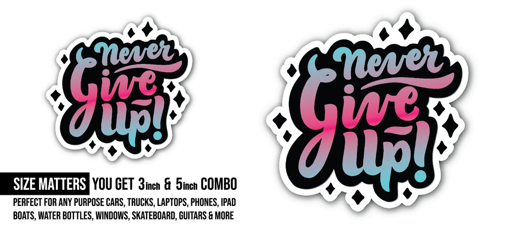 2 (Pieces) 3" and 5" Never Give Up Sticker, Waterproof Vinyl Decals for Many Purpose Like Cars, Trucks, Laptops, Phones, Windows and More
