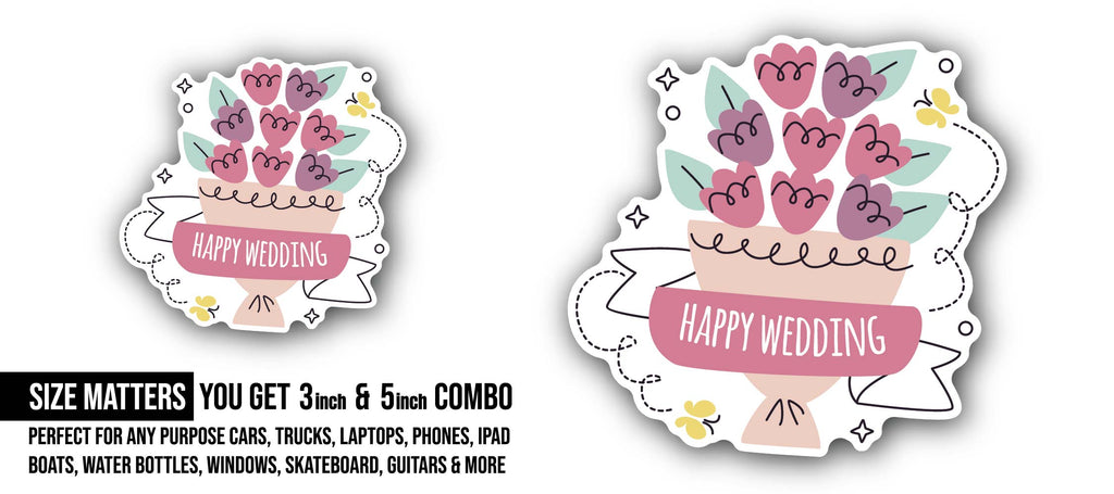 - SIZE MATTERS: Each decal measures approximately 5 inches and 3 inches (2) Pieces- 3 inches and 5 inches. Flower Bouquet with Happy Wedding Sticker DESIGN: This vinyl decal features a design perfect for customizing vehicles, trucks, laptops, windows, computers, bottles, flasks, skateboards, phones, walls, glass, RVs, boats, and more with a patriotic flair.