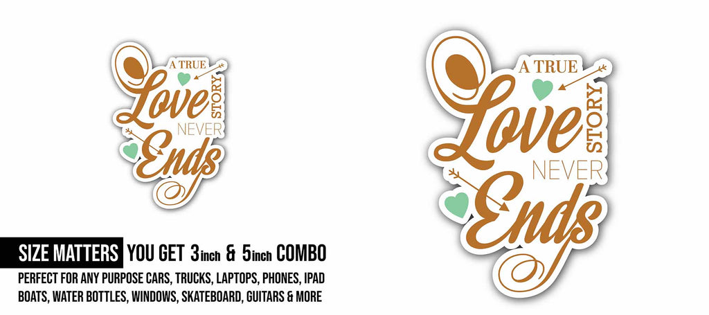 - SIZE MATTERS: Each decal measures approximately 5 inches and 3 inches (2) Pieces- 3 inches and 5 inches. Brown Color A True Love Story Sticker DESIGN: This vinyl decal features a design perfect for customizing vehicles, trucks, laptops, windows, computers, bottles, flasks, skateboards, phones, walls, glass, RVs, boats, and more with a patriotic flair.