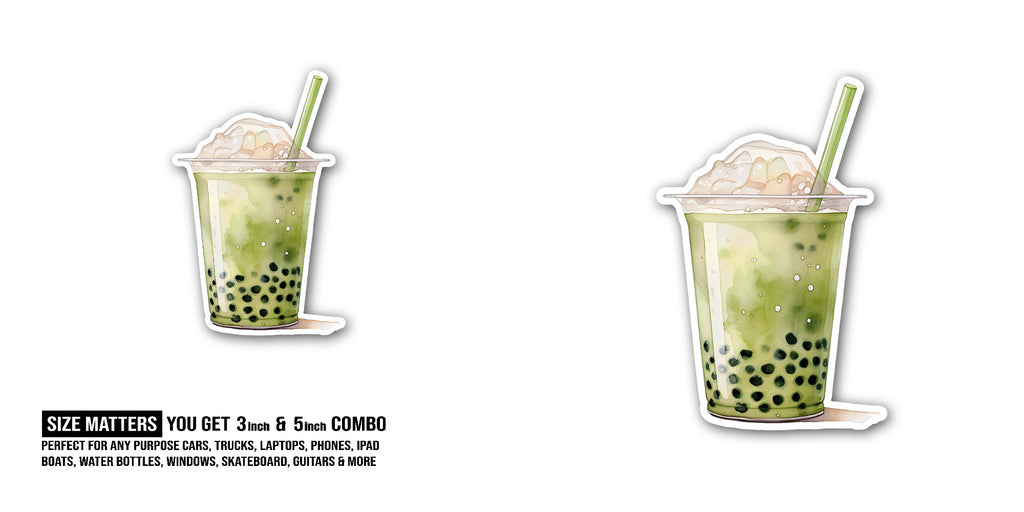 - SIZE MATTERS: Each decal measures approximately 5 inches and 3 inches (2) Pieces- 3 inches and 5 inches. Matcha Green Bubble Tea Sticker DESIGN: This vinyl decal features a design perfect for customizing vehicles, trucks, laptops, windows, computers, bottles, flasks, skateboards, phones, walls, glass, RVs, boats, and more with a patriotic flair.