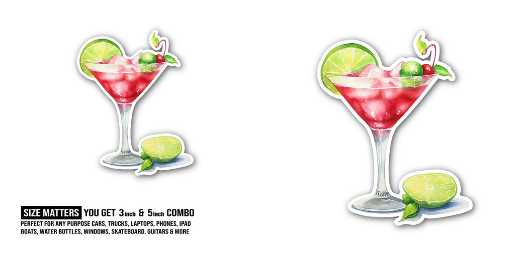 - SIZE MATTERS: Each decal measures approximately 5 inches and 3 inches (2) Pieces- 3 inches and 5 inches. Glass of pink cocktail With Lemon Sticker DESIGN: This vinyl decal features a design perfect for customizing vehicles, trucks, laptops, windows, computers, bottles, flasks, skateboards, phones, walls, glas