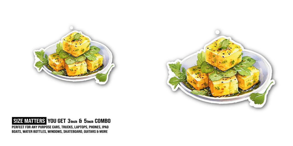 - SIZE MATTERS: Each decal measures approximately 5 inches and 3 inches (2) Pieces- 3 inches and 5 inches. Tasty Dhokla Plate Sticker DESIGN: This vinyl decal features a design perfect for customizing vehicles, trucks, laptops, windows, computers, bottles, flasks, skateboards, phones, walls, glas