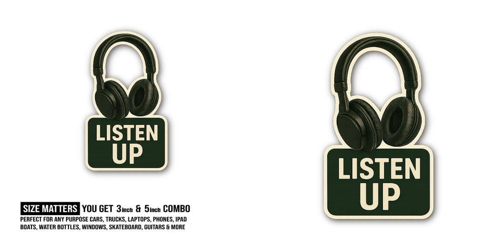 2 (Pieces) 3" and 5" LISTEN UP Sticker, Waterproof Vinyl Decals for Many Purpose Like Cars, Trucks, Laptops, Phones, Windows and More
