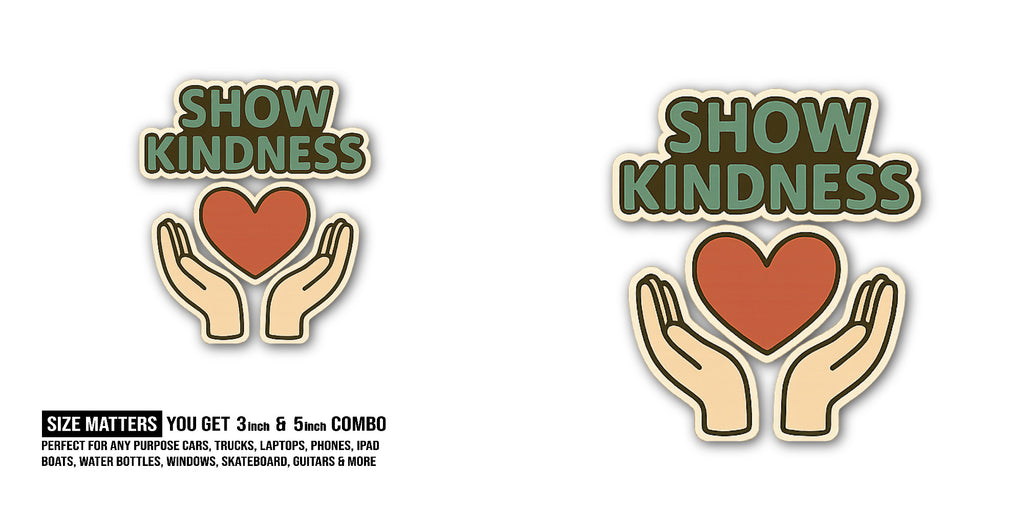 - SIZE MATTERS: Each decal measures approximately 5 inches and 3 inches (2) Pieces- 3 inches and 5 inches. SHOW KINDNESS Sticker DESIGN: This vinyl decal features a design perfect for customizing vehicles, trucks, laptops, windows, computers, bottles, flasks, skateboards, phones, walls, glass, RVs, boats, and more with a patriotic flair.