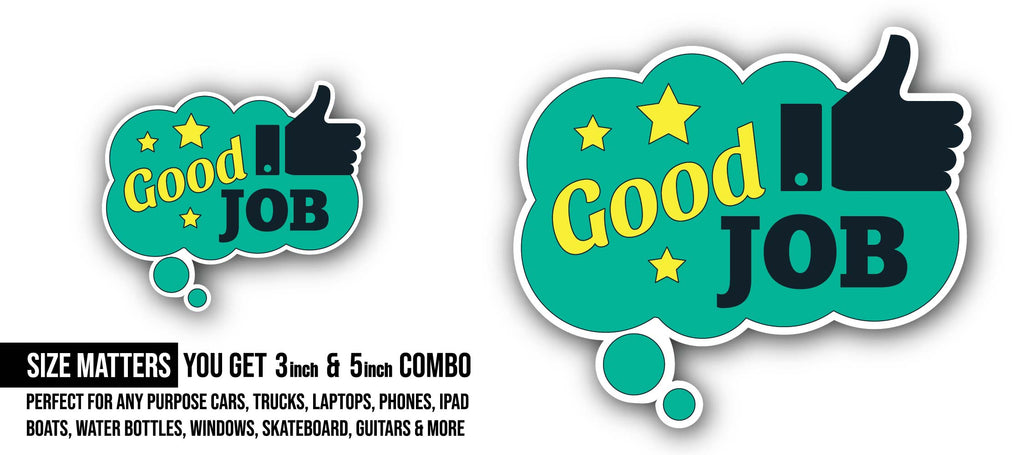 - SIZE MATTERS: Each decal measures approximately 5 inches and 3 inches (2) Pieces- 3 inches and 5 inches. Good Job Text Sticker DESIGN: This vinyl decal features a design perfect for customizing vehicles, trucks, laptops, windows, computers, bottles, flasks, skateboards, phones, walls, glass, RVs, boats, and more with a patriotic flair.