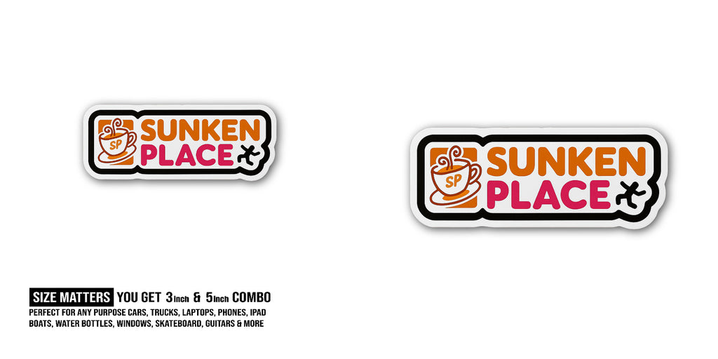 - SIZE MATTERS: Each decal measures approximately 5 inches and 3 inches (2) Pieces- 3 inches and 5 inches. SUNKEN PLACE Sticker DESIGN: This vinyl decal features a design perfect for customizing vehicles, trucks, laptops, windows, computers, bottles, flasks, skateboards, phones, walls, glass, RVs, boats, and more with a patriotic flair.