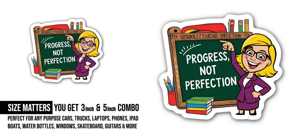- SIZE MATTERS: Each decal measures approximately 5 inches and 3 inches (2) Pieces- 3 inches and 5 inches. "Progress, Not Perfection" Quote Sticker DESIGN: This vinyl decal features a design perfect for customizing vehicles, trucks, laptops, windows, computers, bottles, flasks, skateboards, phones, walls, glass, RVs, boats, and more with a patriotic flair.