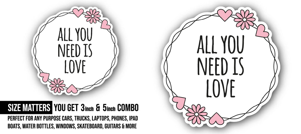 2 (Pieces) 3" and 5" Flowers & Heart with All You Need is Love Sticker, Waterproof Vinyl Decals for Many Purpose Like Cars, Trucks, Laptops, Phones, Windows and More