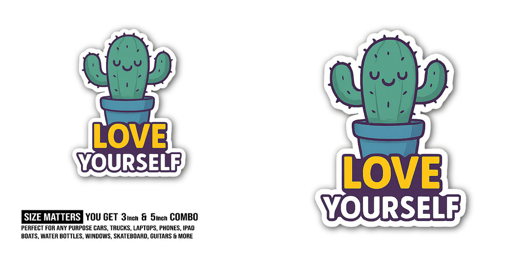 2 (Pieces) 3" and 5" LOVE YOURSELF & cute cactus Sticker, Waterproof Vinyl Decals for Many Purpose Like Cars, Trucks, Laptops, Phones, Windows and More