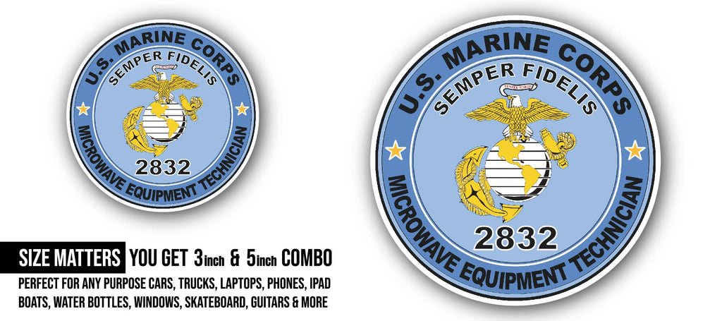 - SIZE MATTERS: Each decal measures approximately 5 inches and 3 inches (2) Pieces- 3 inches and 5 inches. Microwave Equipment Technician MOS 2832 U.S.M.C Military Sticker DESIGN: This vinyl decal features a design perfect for customizing vehicles, trucks, laptops, windows, computers, bottles, flasks, skateboards, phones, walls, glass, RVs, boats, and more with a patriotic flair.