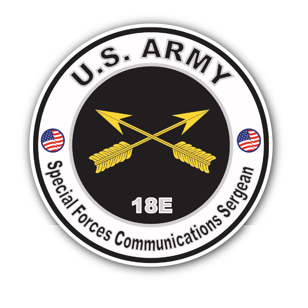 - SIZE MATTERS: Each decal measures approximately 5 inches and 3 inches (2) Pieces- 3 inches and 5 inches. U.S. Army MOS 18E Special Forces Communications Sergeant Sticker DESIGN: This vinyl decal features a design perfect for customizing vehicles, trucks, laptops, windows, computers, bottles, flasks, skateboards, phones, walls, glass, RVs, boats, and more with a patriotic flair.