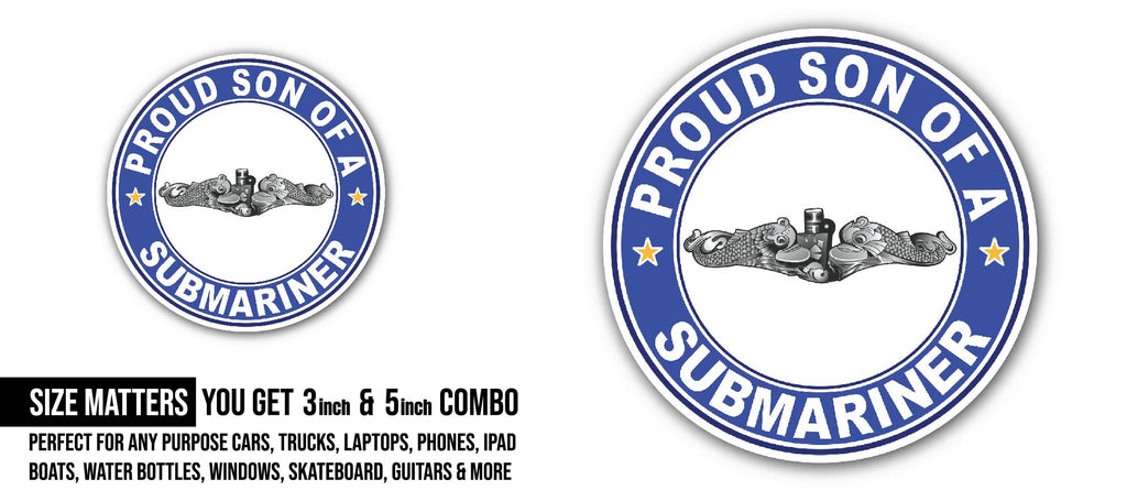 - SIZE MATTERS: Each decal measures approximately 5 inches and 3 inches (2) Pieces- 3 inches and 5 inches. Proud Son of a Submariner Silver Dolphins Sticker DESIGN: This vinyl decal features a design perfect for customizing vehicles, trucks, laptops, windows, computers, bottles, flasks, skateboards, phones, walls, glass, RVs, boats, and more with a patriotic flair.