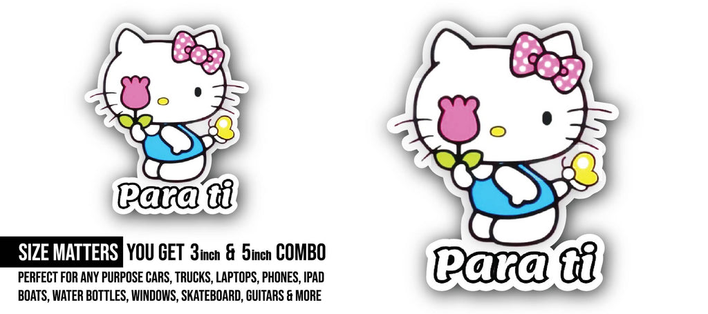 - SIZE MATTERS: Each decal measures approximately 5 inches and 3 inches (2) Pieces- 3 inches and 5 inches. Kitty with flower Sticker DESIGN: This vinyl decal features a design perfect for customizing vehicles, trucks, laptops, windows, computers, bottles, flasks, skateboards, phones, walls, glass, RVs, boats, and more with a patriotic flair.
