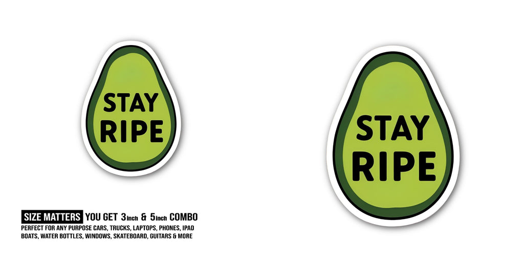 - SIZE MATTERS: Each decal measures approximately 5 inches and 3 inches (2) Pieces- 3 inches and 5 inches. Stay Ripe Avocado Sticker DESIGN: This vinyl decal features a design perfect for customizing vehicles, trucks, laptops, windows, computers, bottles, flasks, skateboards, phones, walls, glass, RVs, boats, and more with a patriotic flair.