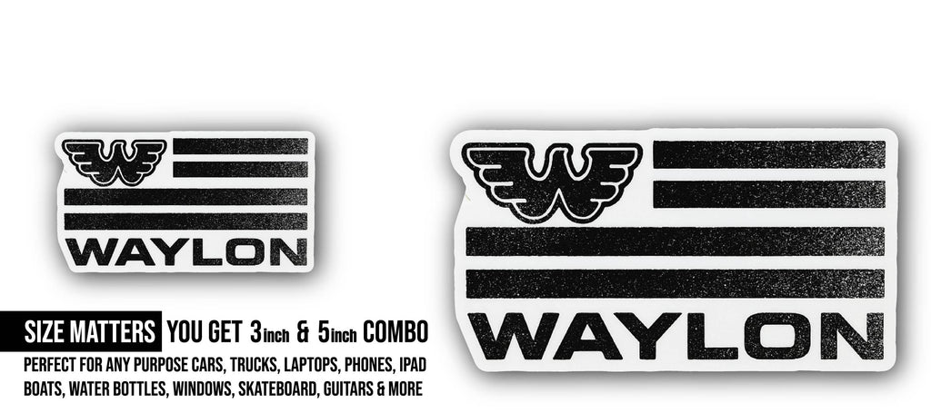 - SIZE MATTERS: Each decal measures approximately 5 inches and 3 inches (2) Pieces- 3 inches and 5 inches. Waylon Sticker DESIGN: This vinyl decal features a design perfect for customizing vehicles, trucks, laptops, windows, computers, bottles, flasks, skateboards, phones, walls, glass, RVs, boats, and more with a patriotic flair.
