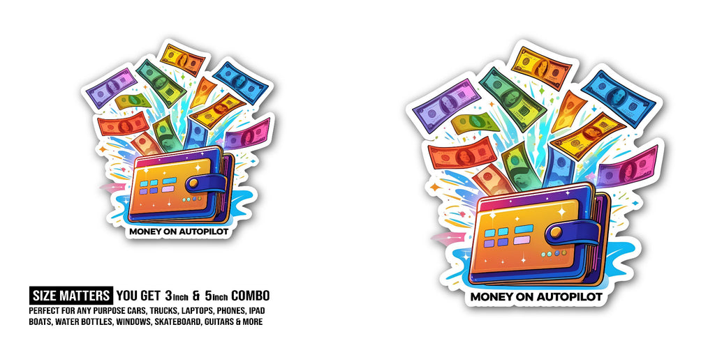 - SIZE MATTERS: Each decal measures approximately 5 inches and 3 inches (2) Pieces- 3 inches and 5 inches. MONEY ON AUTOPILOT Sticker DESIGN: This vinyl decal features a design perfect for customizing vehicles, trucks, laptops, windows, computers, bottles, flasks, skateboards, phones, walls, glass, RVs, boats, and more with a patriotic flair.