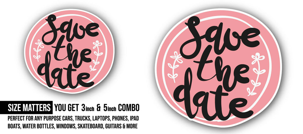- SIZE MATTERS: Each decal measures approximately 5 inches and 3 inches (2) Pieces- 3 inches and 5 inches. Circle Shape and Save The Date Text Sticker DESIGN: This vinyl decal features a design perfect for customizing vehicles, trucks, laptops, windows, computers, bottles, flasks, skateboards, phones, walls, glass, RVs, boats, and more with a patriotic flair.