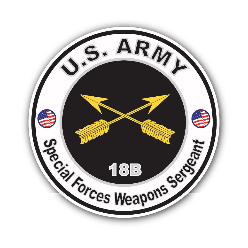 - SIZE MATTERS: Each decal measures approximately 5 inches and 3 inches (2) Pieces- 3 inches and 5 inches. U.S. Army MOS 18B Special Forces Weapons Sergeant Sticker DESIGN: This vinyl decal features a design perfect for customizing vehicles, trucks, laptops, windows, computers, bottles, flasks, skateboards, phones, walls, glass, RVs, boats, and more with a patriotic flair.