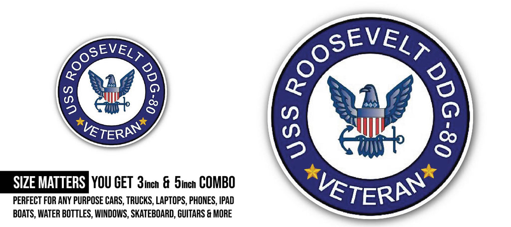 - SIZE MATTERS: Each decal measures approximately 5 inches and 3 inches (2) Pieces- 3 inches and 5 inches. USS Roosevelt DDG-80 Veteran Sticker DESIGN: This vinyl decal features a design perfect for customizing vehicles, trucks, laptops, windows, computers, bottles, flasks, skateboards, phones, walls, glass, RVs, boats, and more with a patriotic flair.