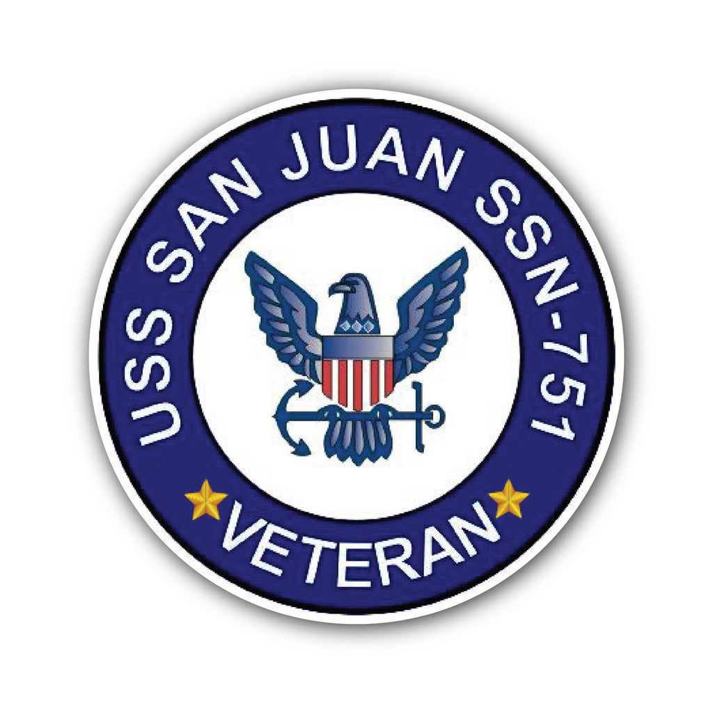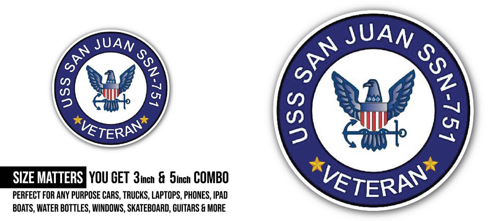 - SIZE MATTERS: Each decal measures approximately 5 inches and 3 inches (2) Pieces- 3 inches and 5 inches. USS San Juan SSN-751 Veteran Sticker DESIGN: This vinyl decal features a design perfect for customizing vehicles, trucks, laptops, windows, computers, bottles, flasks, skateboards, phones, walls, glass, RVs, boats, and more with a patriotic flair.